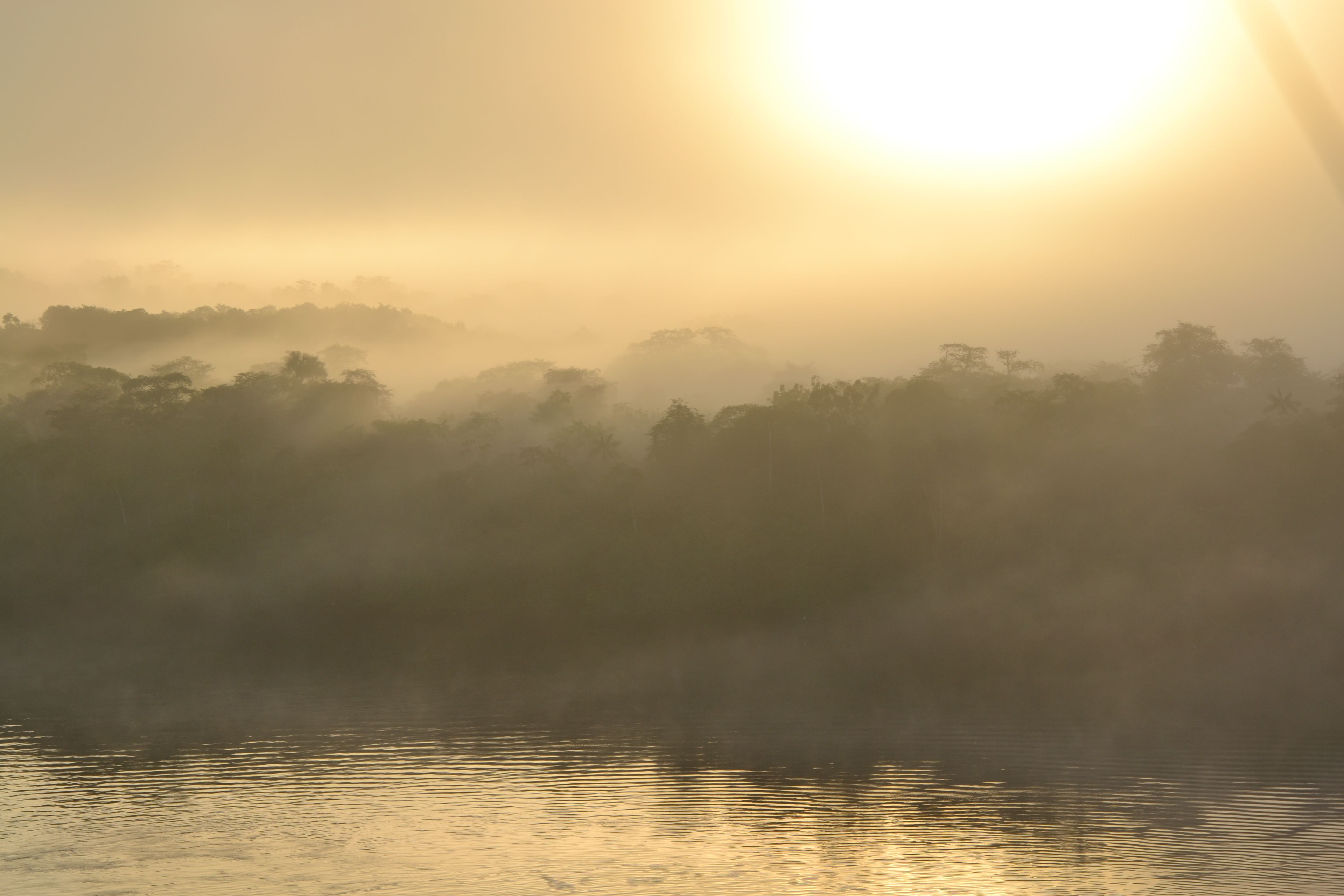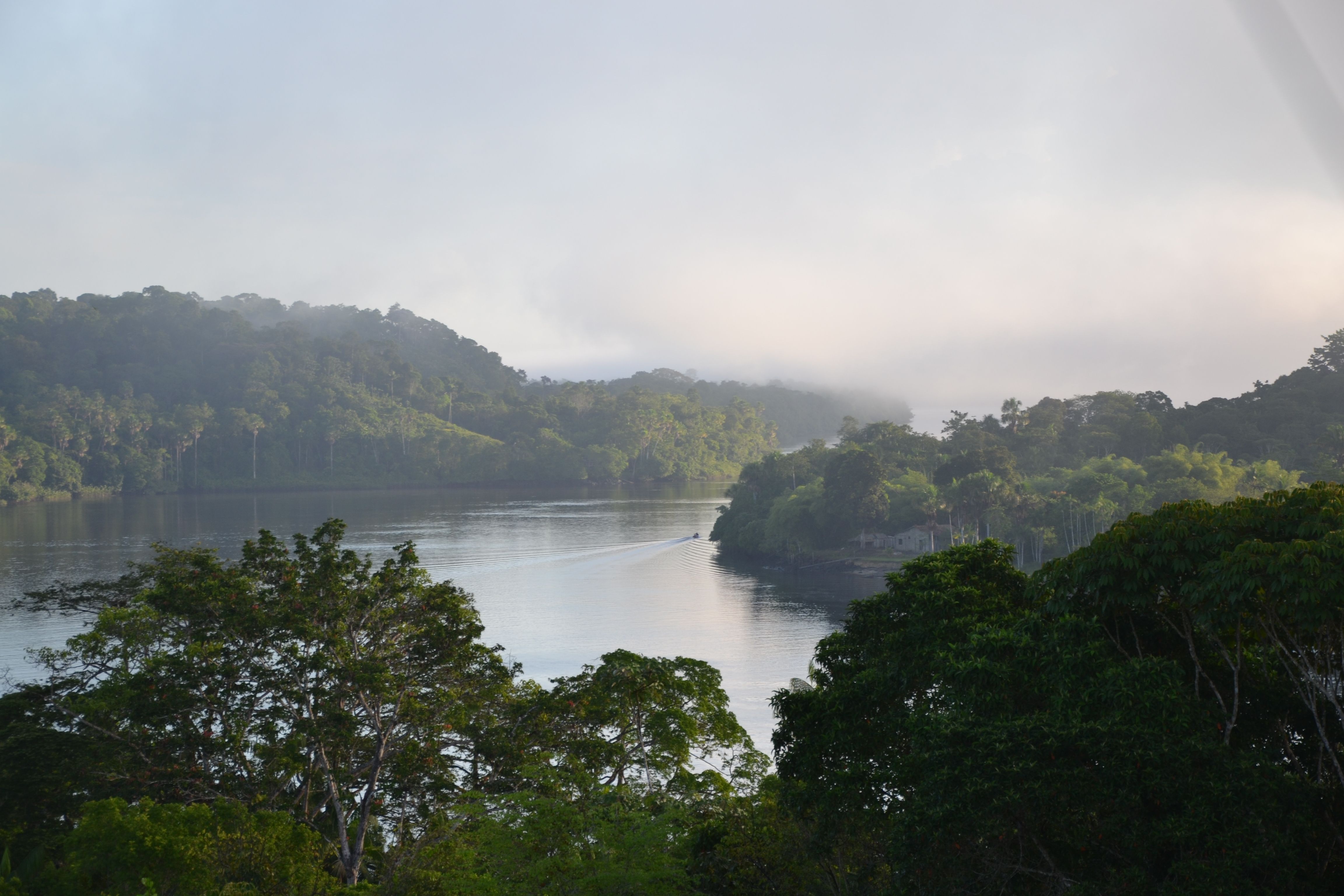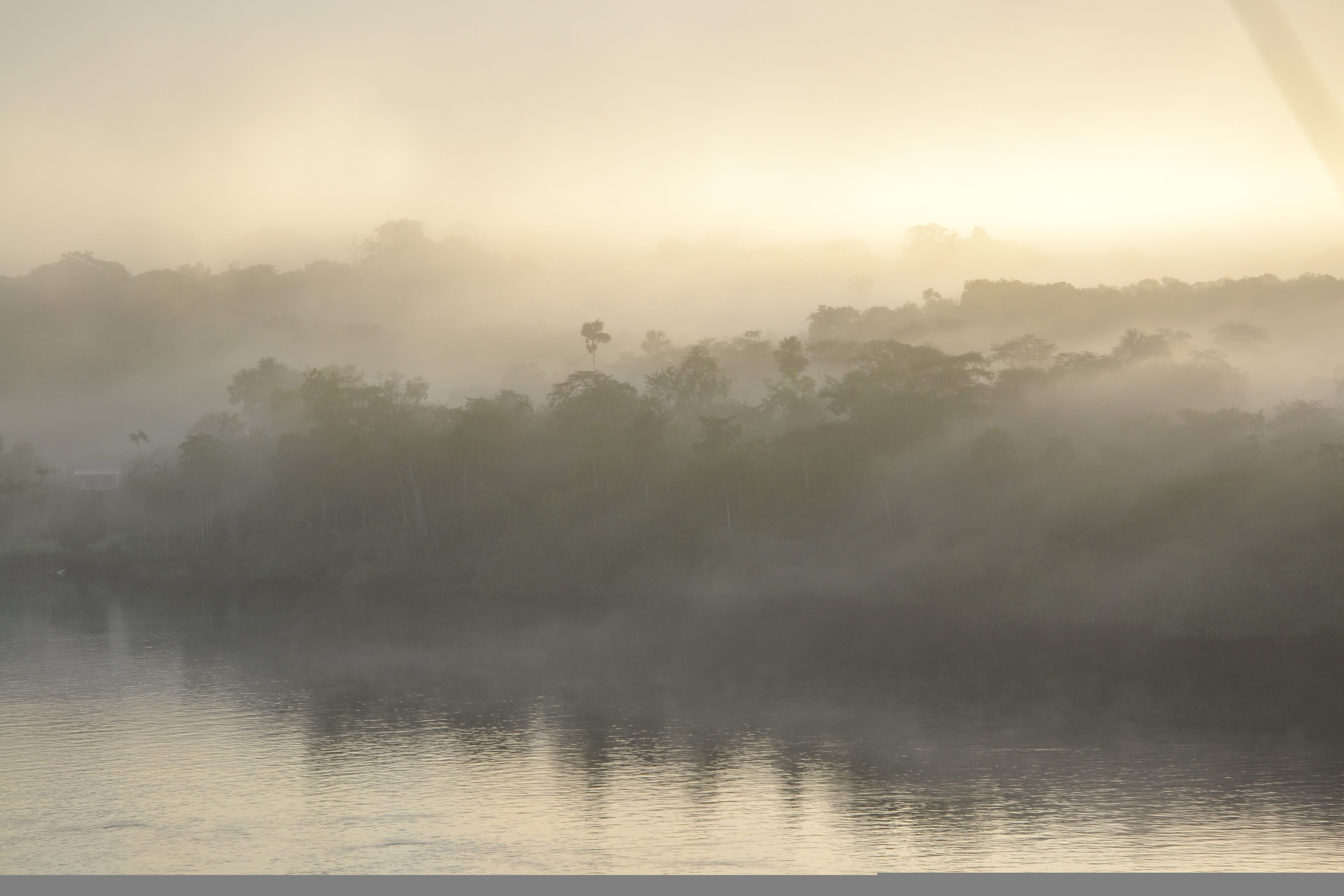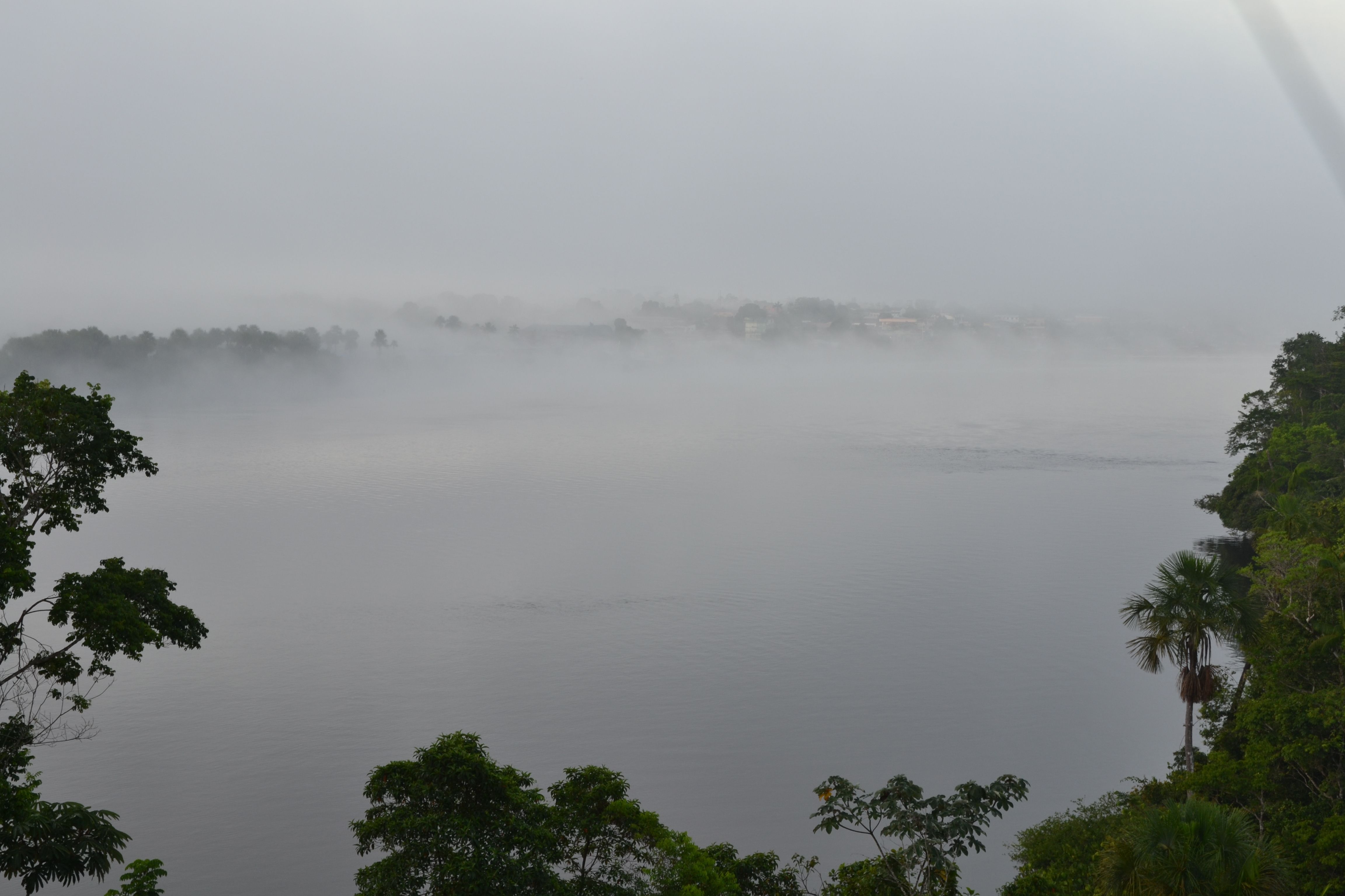 On aperçoit le village Brésilien d'Oiapoque recouvert par la brume matinale.